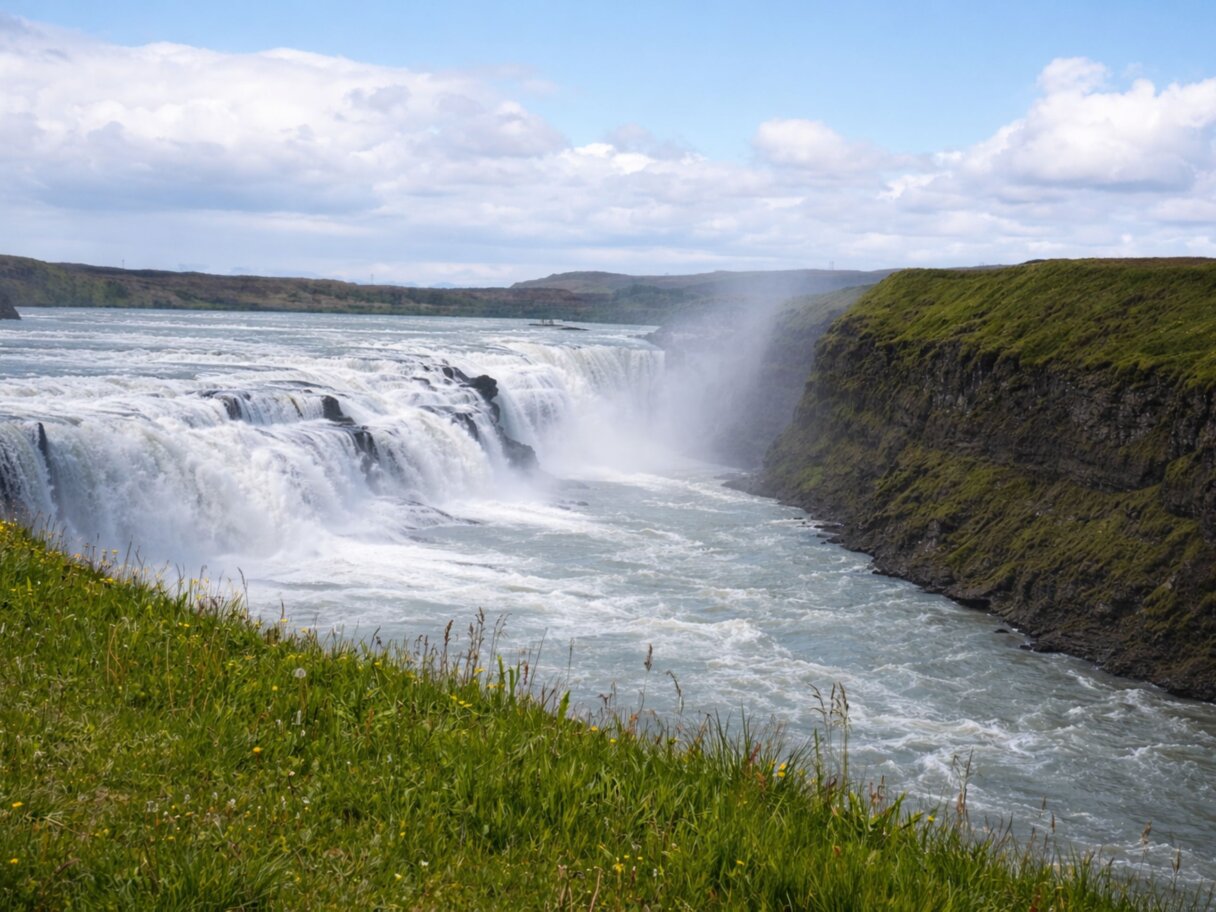 Poté navštívíme „zlatý vodopád“ Gullfoss, jehož mohutné kaskády padají do hlubokého kaňonu a vytvářejí nezapomenutelnou podívanou. Nedaleko se nachází geotermální oblast Geysir, kde kdysi chrlil vodu do výšky desítek metrů slavný pramen, který dal jméno všem gejzírům světa. Dnes se můžeme těšit na jeho mladšího a aktivního souseda – gejzír Strokkur, jenž každých několik minut vystřelí proud horké vody až do výšky 10–20 metrů.