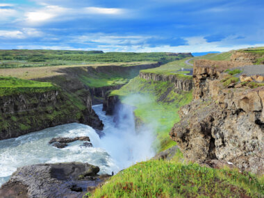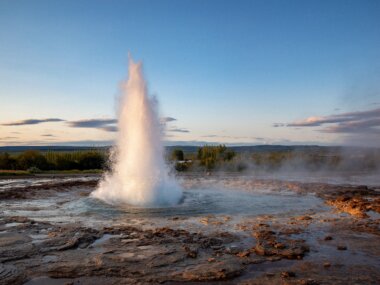 Druhou zastávkou bude „zlatý vodopád“ Gullfoss, který se nachází nedaleko horkého pramene Geysir. Právě ten dal jméno všem typům tohoto vodního jevu na světě. Dnes již Geysir bohužel není aktivní, avšak o 30 metrů dál najdeme jeho menšího dvojníka, gejzír Strokkur. Každých 5 až 10 minut vychrlí vodu do výšky zhruba 10 metrů.